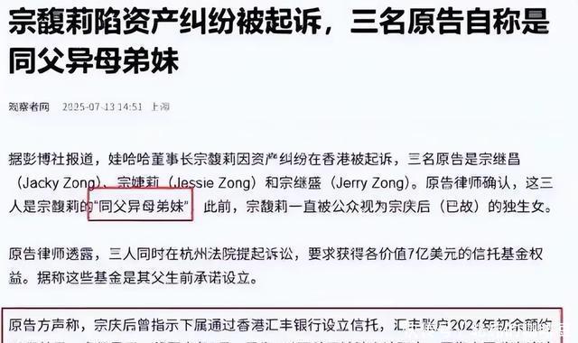 还有一位传闻是宗庆后别墅的管家,8岁小儿子宗继盛的母亲,相貌平平身材壮实。不过这些传闻还待确认。 2025年7月,一纸诉状拉开了遗产争夺序幕,三名原告自称宗馥莉的同父异母三兄妹,意图很明确。不仅要分走老爷子承诺的21亿美元,还要娃哈哈集团29.4%的股份。