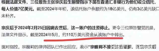 宗馥莉面对三名自称“同父异母弟妹”的美籍子女分割巨额遗产的起诉,并没有慌乱,给予了反击。 当对方指控她挪用信托资金,甩出越南工厂设备采购合同以及110万美元付款凭证,以此证明这笔款项并非挪用。 她的律师团队甩出了一份宗庆后在2020年亲笔签名的遗嘱:本人所有境外资产均由独女宗馥莉继承。这份遗嘱有公司高管见证。 他们声称宗庆后要给21亿的信托,宗馥莉也说她爸没交代这个事。